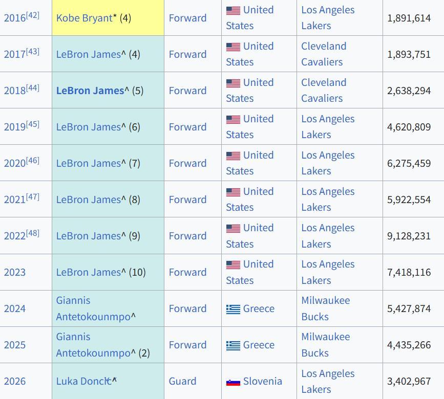 值得一提的是,在此前10年的全明星票选中,东契奇的队友詹姆斯7次夺得票王,此外字母哥2次夺魁,科比则在退役赛季夺得票王。